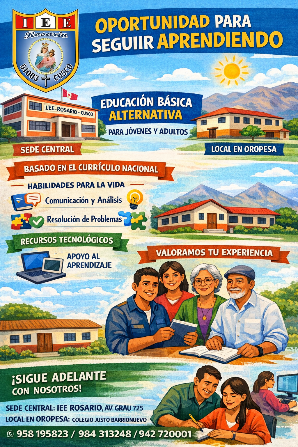 La comunidad educativa rosarina te invita a formar parte del CEBA N.° 51003 Rosario – Cusco, una oportunidad dirigida a jóvenes y personas adultas que desean culminar su educación primaria.